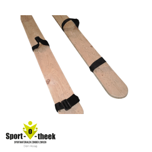 Zwarte 4 persoons ski’s met rode of blauwe neus. Met vier personen tegelijk vooruit zien te komen, hilariteit alom. Afmetingen bij benadering: 180 cm lang x 15 cm breed.